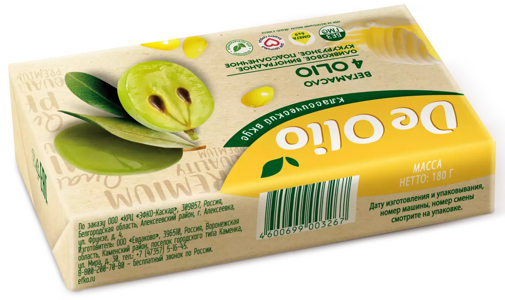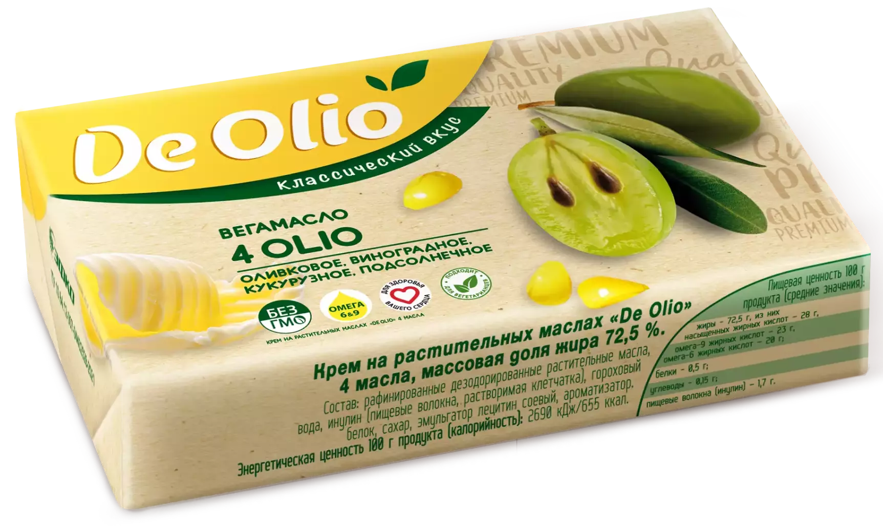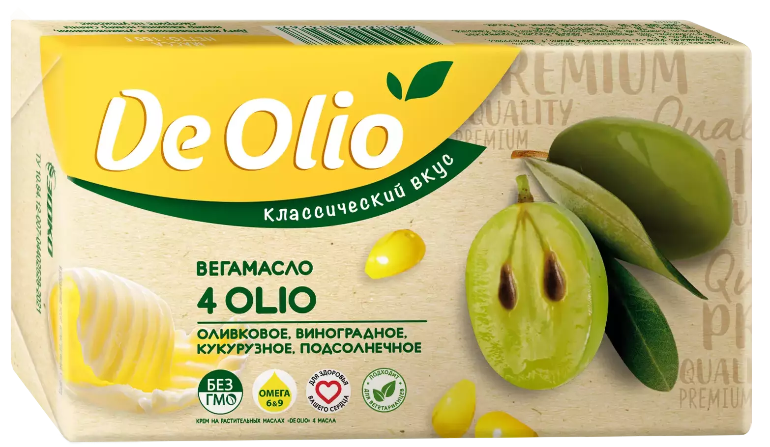 Вегамасло De Olio имеет полностью растительный состав и создано для тех, кто готов разнообразить питание и включить в свой рацион больше полезных растительных жиров в привычной для употребления форме. Классический нежный и сливочный вкус масла 4OLIO легко заменит традиционное масло в бутербродах, кашах, и даже домашней выпечке. За счет сбалансированного сочетания микса оливкового, виноградного, кукурузного, подсолнечного масел вегамасло 4 Olio поможет поддерживать организм в тонусе и улучшить ваше настроение на весь день.