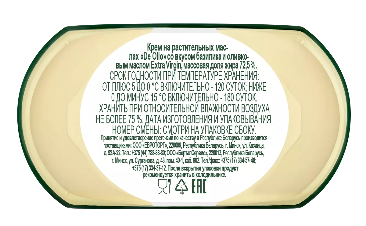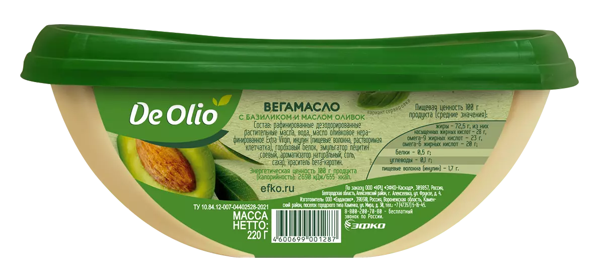 - Состав: рафинированные дезодорированные растительные масла, вода, масло оливковое нерафинированное Extra Virgin, инулин (пищевые волокна, растворимая клетчатка), гороховый белок, эмульгатор лецитин соевый, ароматизатор натуральный, соль, сахар, краситель бета-каротин.